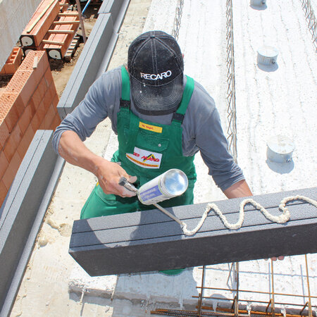 JOMA Deckenrandschalungen werden einfach und ohne großen Aufwand auf staubfreiem Untergrund mit geeignetem Klebeschaum aufgeklebt. Eventuelle Unebenheiten des Mauerwerks sind vorher auszugleichen.