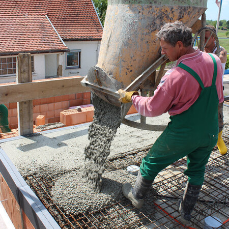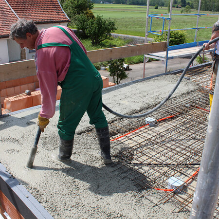 Die Decke wird betoniert, wenn der Kleber vollständig ausgehärtet ist - siehe Herstellerangabe. Beim Rütteln ist ein Abstand zur Randdämmschalung von ca 30 cm einzuhalten. Beim Außenputz wird, nach den Fachrergeln der Technik, ein risseüberbrückendes Gewebegitter über die Deckenrandschalung eingearbeitet. Unmittelbar vor und während des Verputzens ist die Oberfläche vor direkter Sonneneinstrahlung zu schützen